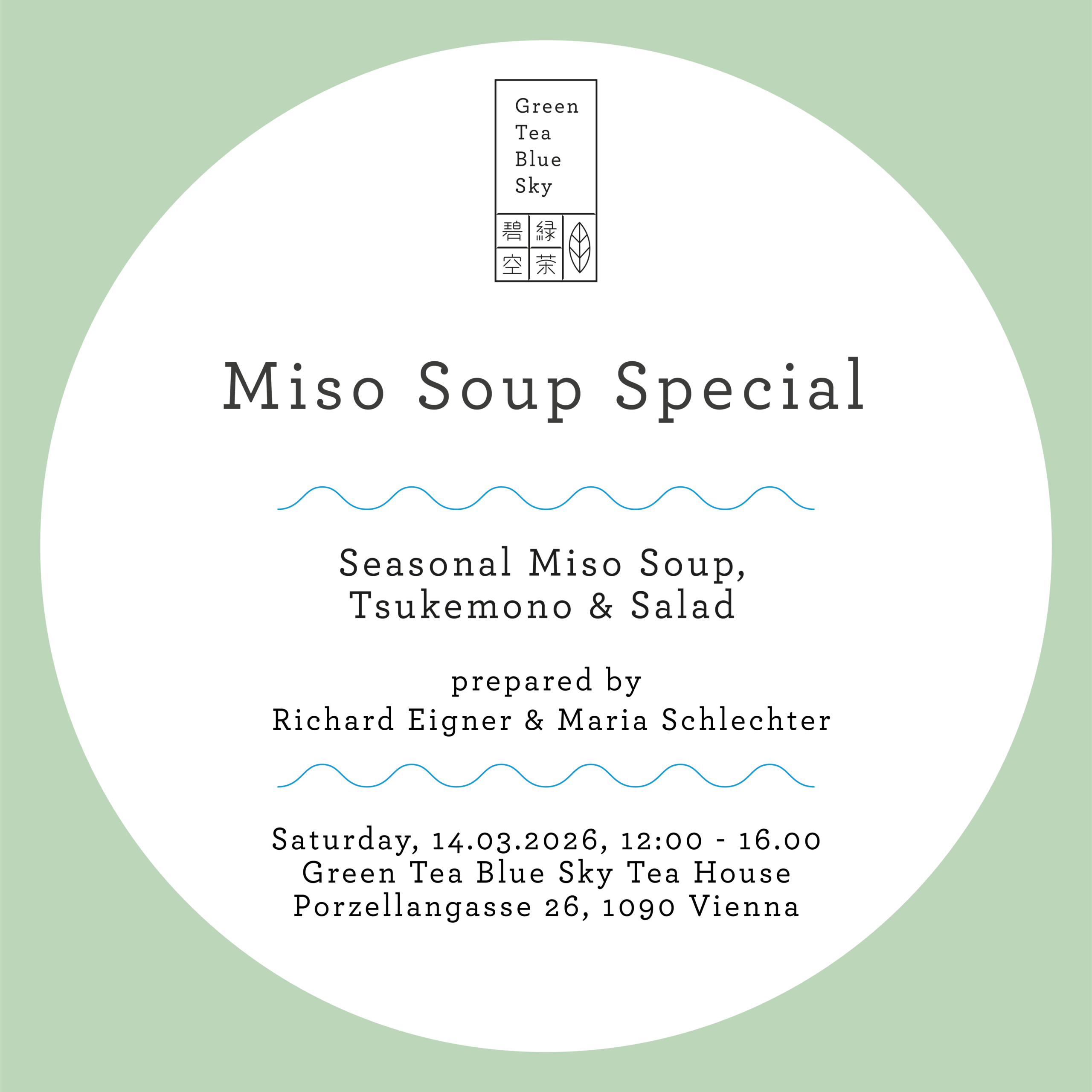 Seasonal Miso Soup with Tsukemono & Salad – further details, will be announced closer to the date! It will be vegan.